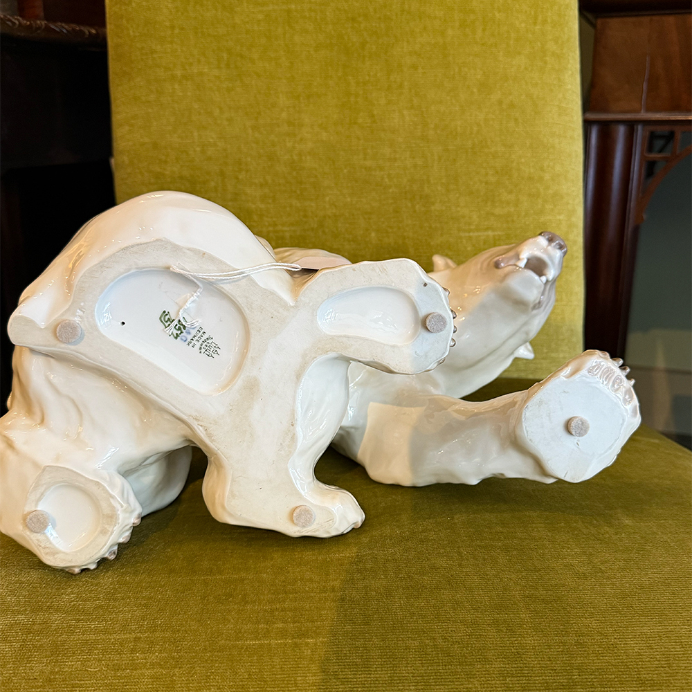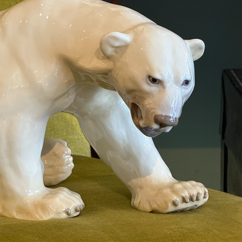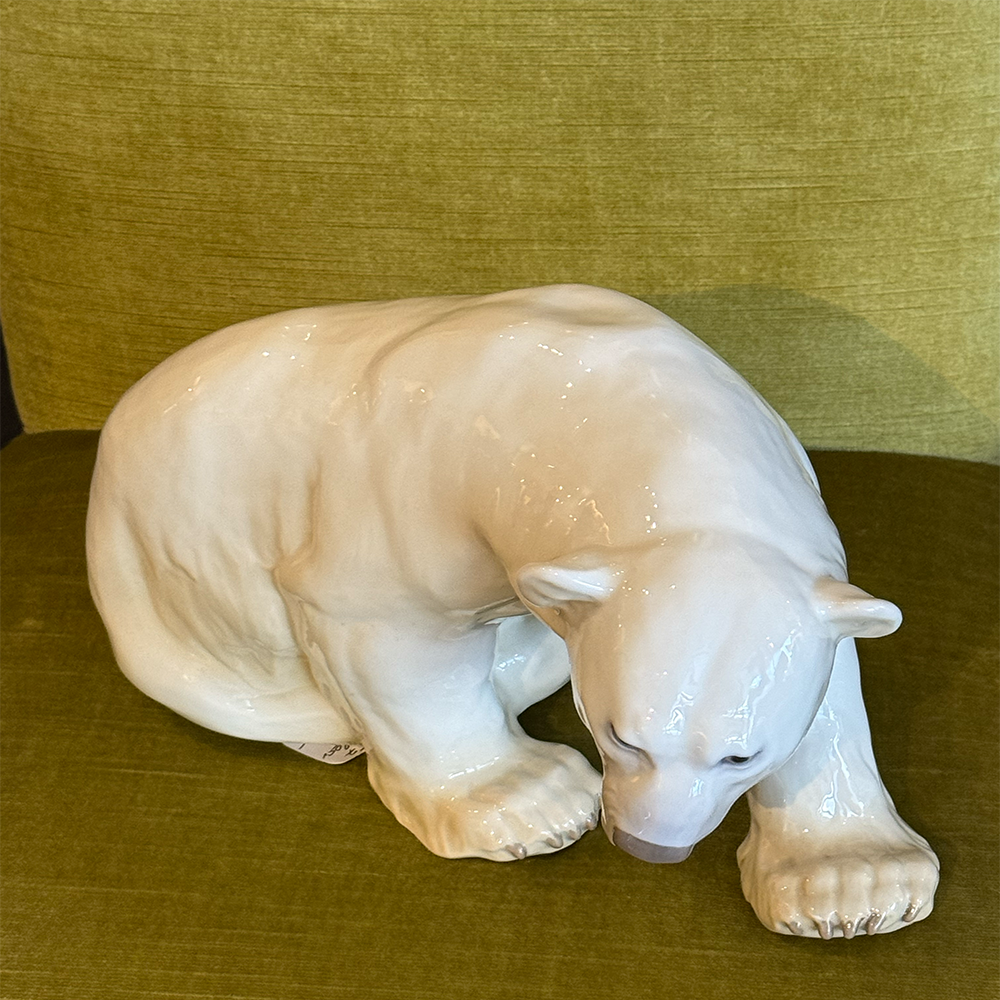 A finely modeled porcelain polar bear by the renowned Danish porcelain manufactory Bing & Grøndahl (B&G), Copenhagen. This sculptural figure captures the quiet strength and natural dignity of the polar bear in a seated, forward-leaning pose, with subtly detailed musculature and expressive features.