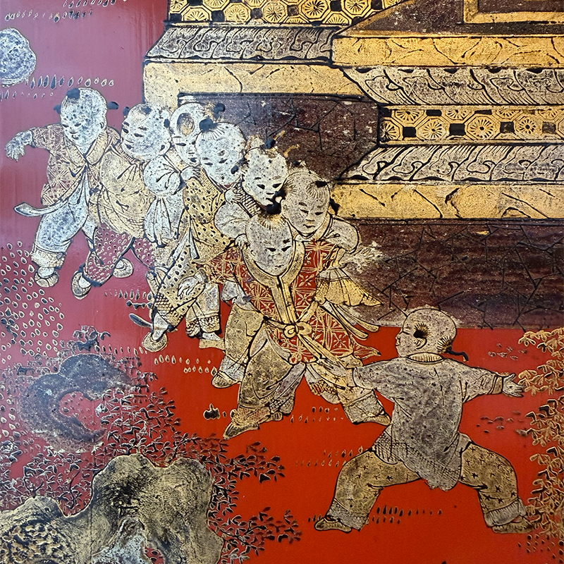 Over time, the lacquer develops a subtle patina that enhances the cabinet’s visual depth. Consequently, the surface displays the character expected from decorative lacquer furniture.