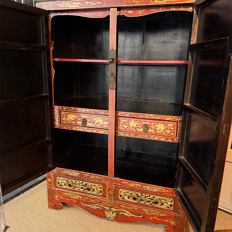 Because of its bold color and detailed decoration, this Chinese red lacquer cabinet combines practical storage with artistic craftsmanship.