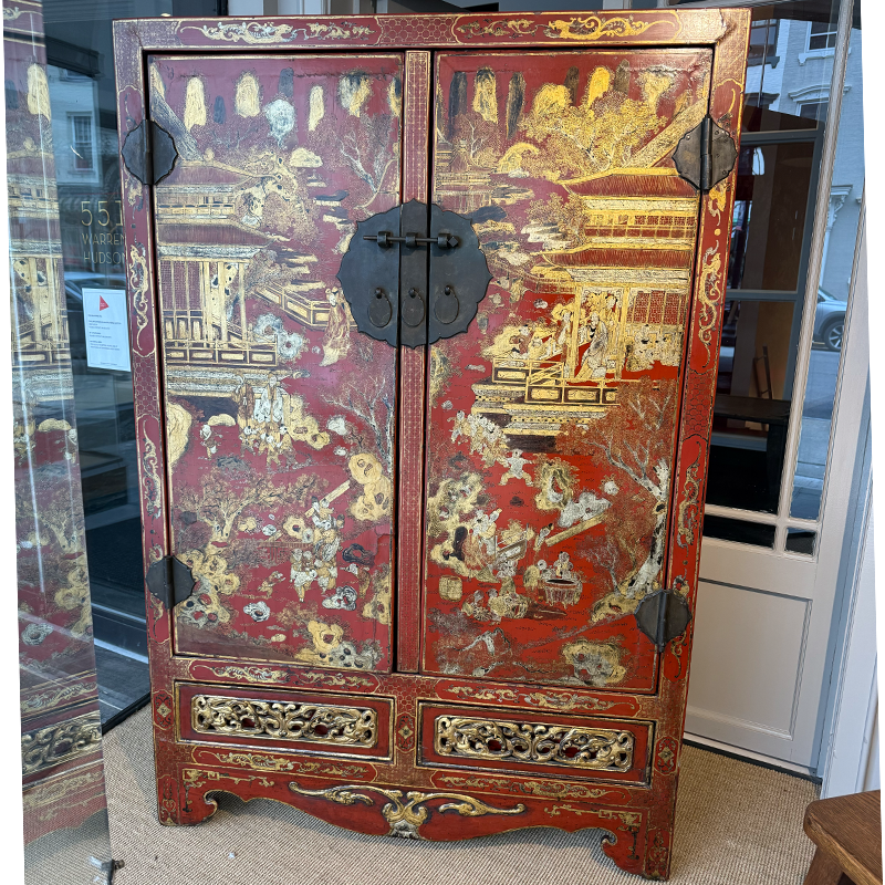 Collectors appreciate furniture like this Chinese red lacquer cabinet for its craftsmanship and cultural symbolism. The combination of lacquer, gilt painting, and brass hardware reflects traditional decorative techniques.