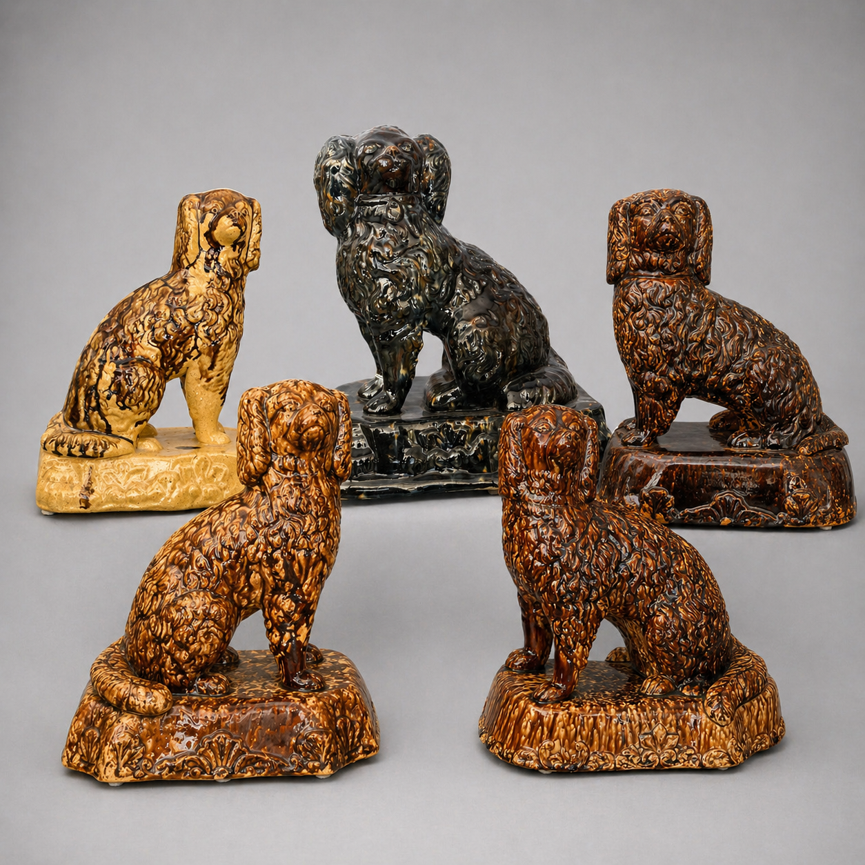 This compelling collection of Bennington-type pottery spaniel dogs represents a classic form within American decorative arts. Notably, each figure displays richly varied Rockingham glaze, creating a dynamic visual grouping. As a result, the ensemble offers both sculptural presence and historical depth, ideal for collectors and interiors alike.