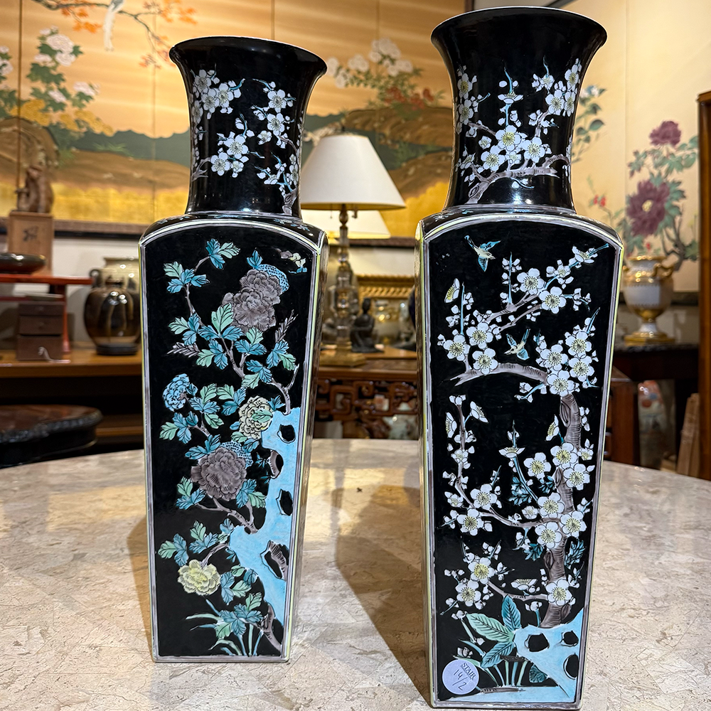 Each vase displays a deep black ground that highlights the delicate enamel decoration. Branches of blossoming plum extend across the surface, while small birds move among the flowers. Soft tones of green, pale blue, white, and subtle yellow create contrast against the dark background. Consequently, the design feels both lively and refined.