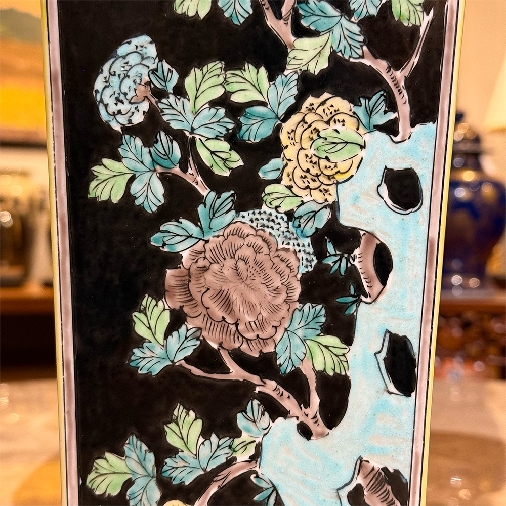 The detailed decoration reflects the aesthetic associated with Famille Verte porcelain. Artisans developed this style during the Qing dynasty and used it widely in later decorative wares. The palette and naturalistic motifs show the continued influence of traditional Chinese porcelain painting.