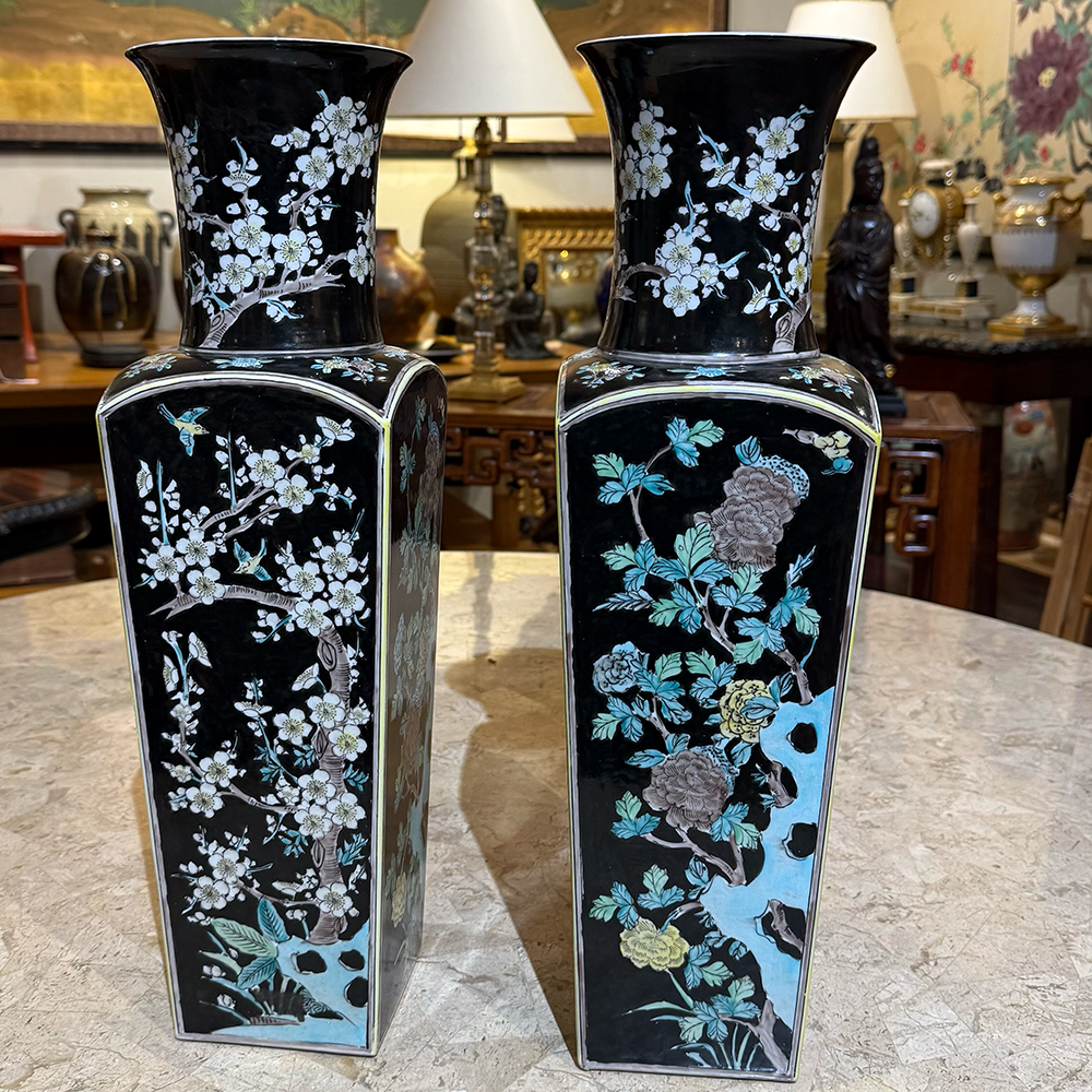 This elegant pair of Chinese porcelain vases features the distinctive decorative style known as Famille Verte. The tall, rectangular bodies rise to gently flared necks, creating a balanced and architectural silhouette. As a result, the pair makes a striking decorative statement when displayed together.