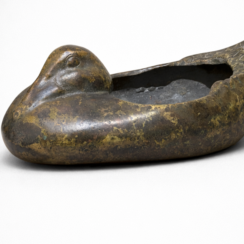 This French sculptural bronze duck vessel reflects the elegance of mid-twentieth century decorative art. The piece dates between the 1930s and 1960s. Its sculptural form blends Art Deco influence with early Mid-Century design principles.