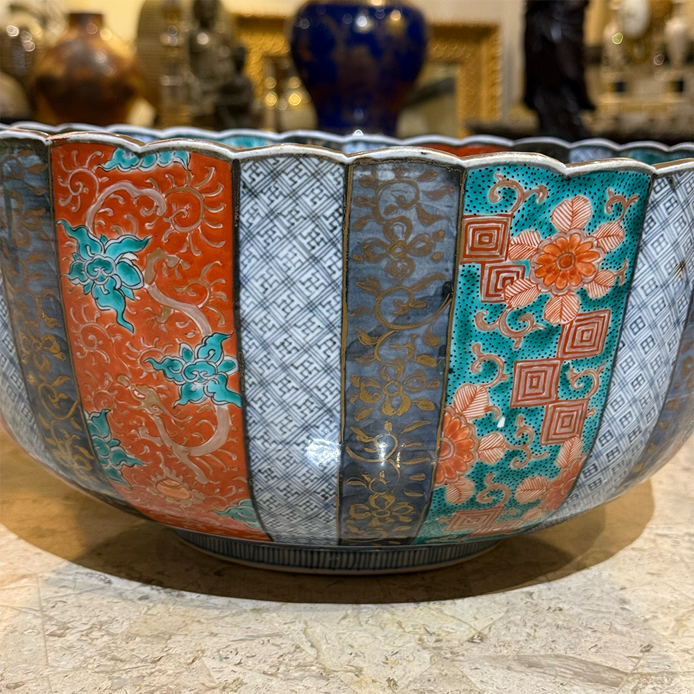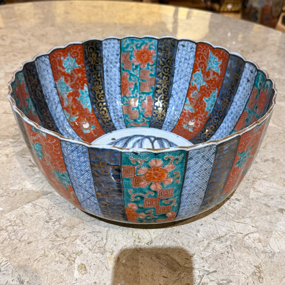 This striking Japanese Imari porcelain bowl features a vibrant palette and richly detailed decoration characteristic of traditional Imari ware. The bowl displays a generous rounded form with a scalloped rim, creating an elegant silhouette that enhances its decorative presence.