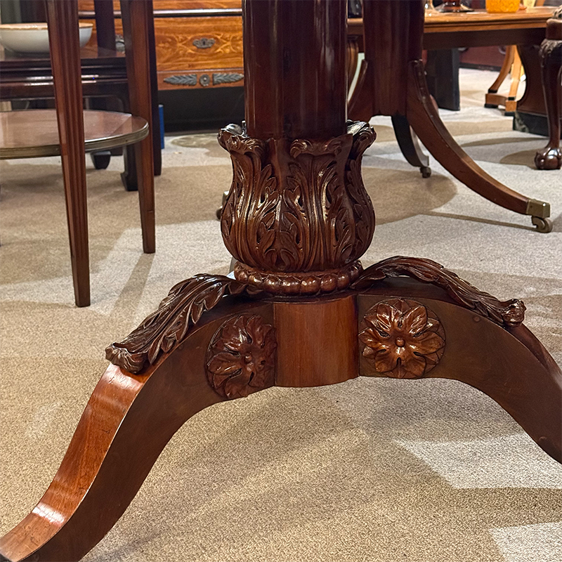 The pedestal base showcases detailed carving with classical influence. The central column features stylized acanthus leaves carved into the wood. This decorative carving adds depth and visual interest to the design.
