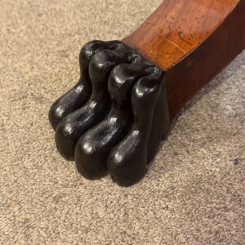 Three curved legs extend from the pedestal base. Each leg ends in a carved paw foot, adding a traditional accent. The flowing shape of the legs provides stability and elegance.