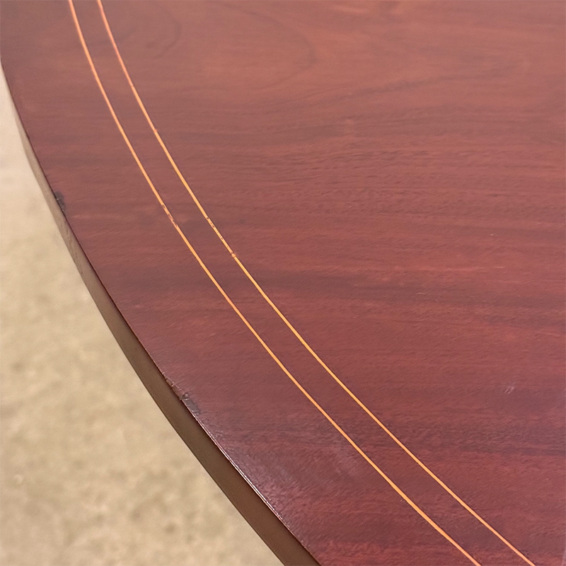 A double band of light string inlay follows the outer edge of the top. This decorative feature creates a crisp border around the surface. The inlay likely uses boxwood or a similar light hardwood. Scandinavian cabinetmakers often used this technique to create refined visual contrast.